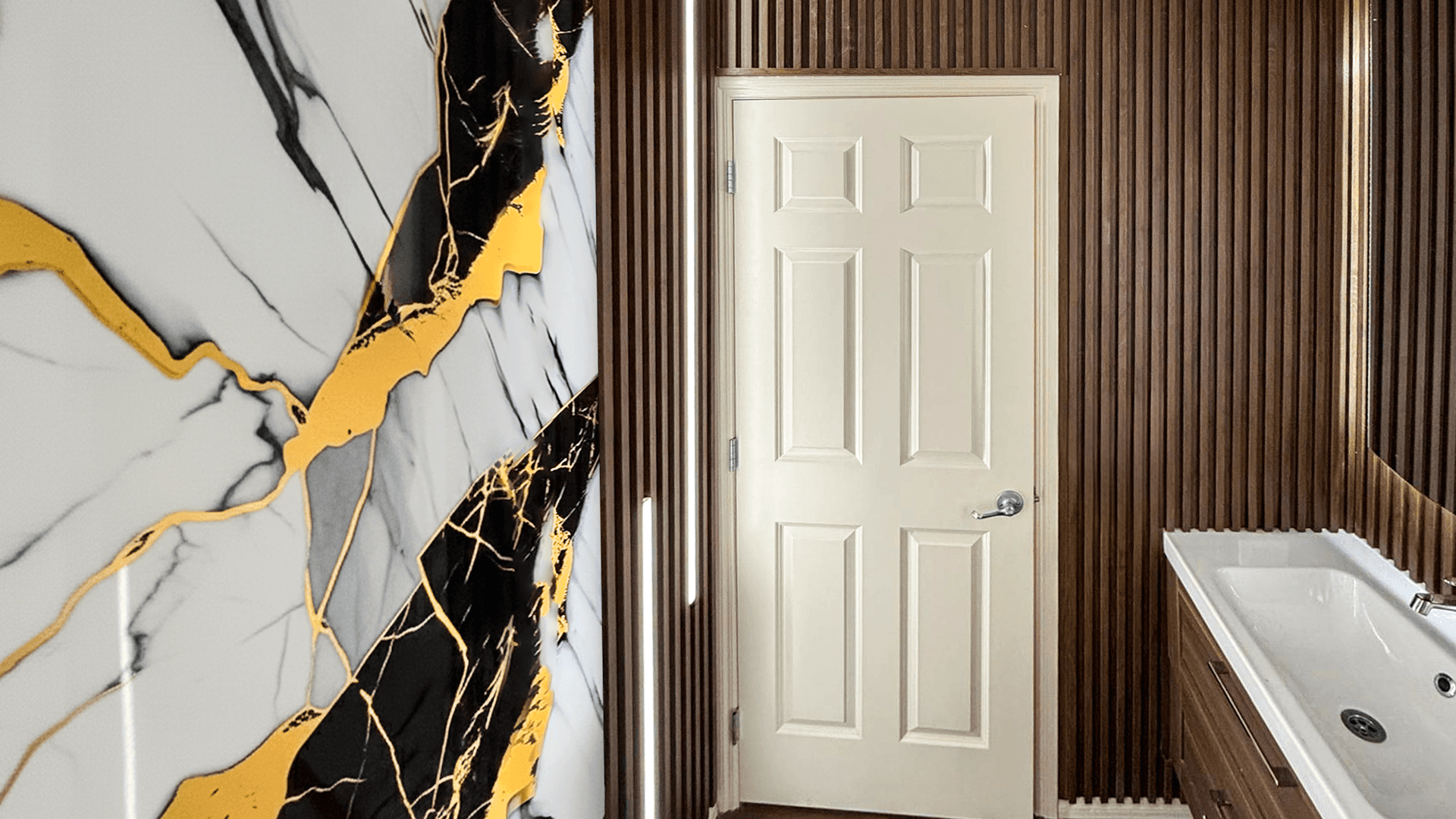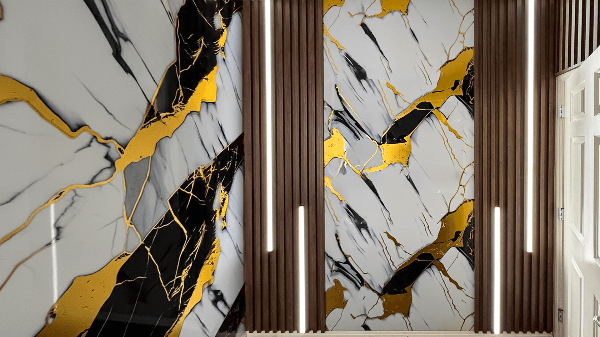 After reviewing several concepts, the selected design combined walnut fluted panels with high gloss marble PVC sheets featuring bold black and gold veining. This pairing offered warmth, contrast, and a strong visual impact. We then moved into detailed planning by measuring wall sections, mapping LED placements, and aligning marble patterns. In a compact space, precision was essential to ensure every element looked intentional.